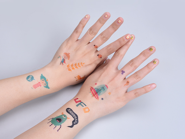 With selected water transfer printing, eco-friendly paper and ink, the “tattoo” can be preserved on skin much longer, and it is quite washable.